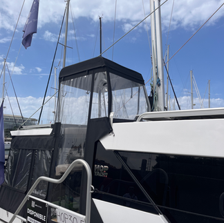 For times when you need to venture out in genuinely challenging conditions, the full helm enclosure option keeps the weather out. This enclosure attaches to the bimini top on all four sides, creating a completely protected helm station while maintaining starboard side deck access through a rollable entrance. Affectionally called a "smiley" ... a zipped u-shaped window on the port side provides access to the winch, meaning the boat can be sailed single-handed from inside the helm enclosure, even in driving rain or cold conditions.
